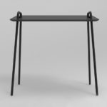 Deux tubes cintrés en acier thermolaqué viennent comme des agrafes traverser en biais un plateau de Valchromat™ noir mat pour le maintenir sur pied. Ces piètements d’acier s’insèrent et s’ajustent parfaitement pour assurer une stabilité totale à l’ensemble, le plateau et les pieds ne font plus qu’un.